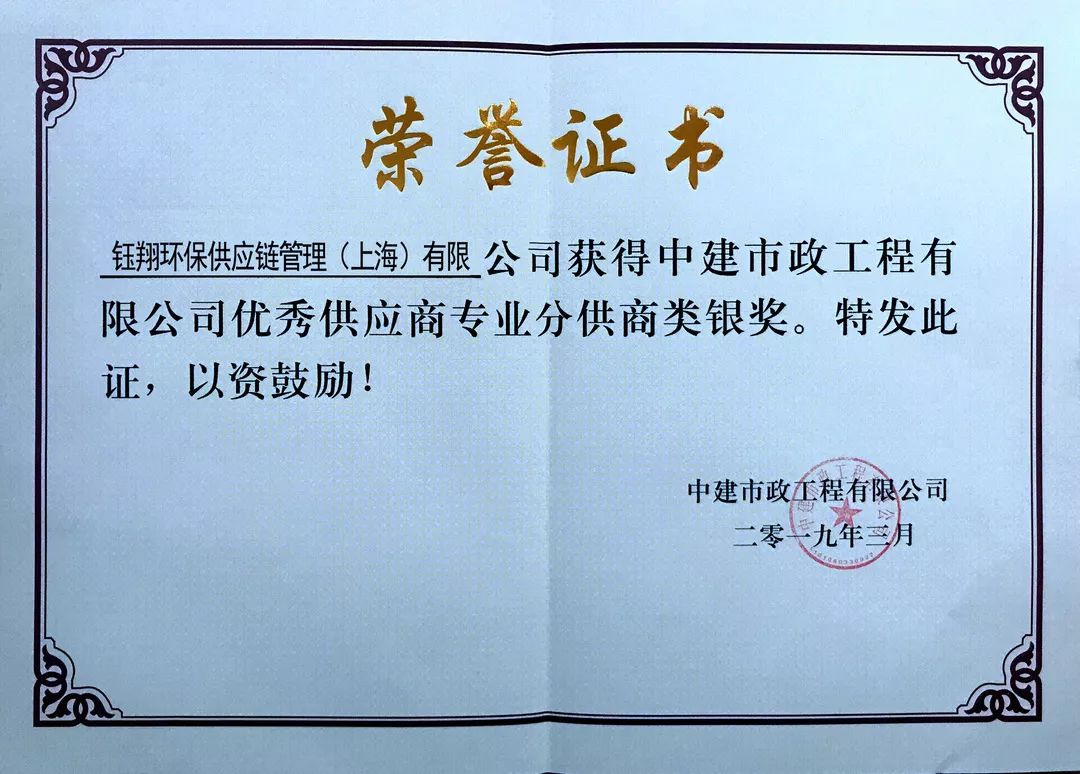 鈺翔環(huán)保供應(yīng)鏈管理(上海)有限公司被中建市政工程有限公司評(píng)為優(yōu)秀供應(yīng)商